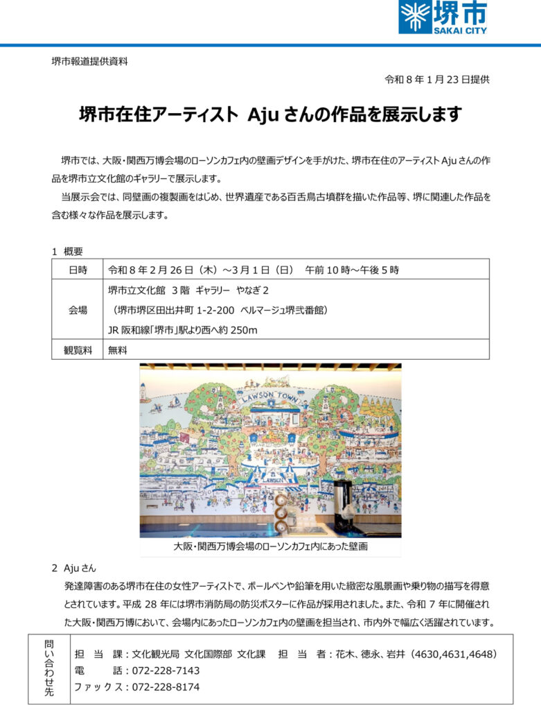 現在の作品とともに、大学生の頃に描いていた作品も当時の額装そのままに展示させていただきます。大阪・関西万博のローソンカフェの壁面イラスト(複製画)も展示いたします。堺にまつわる新しい作品も2点展示します。3月1日(日)は13:00~17:00という短い時間ではありますが、在廊予定です。古墳の作品も1ヶ月かけて制作したので、見に来ていただけると嬉しいです!